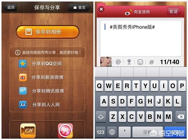 iPhone版里完成美容后,通过界面右上方“保存与分享”按钮即可进入分享界面,选择相应